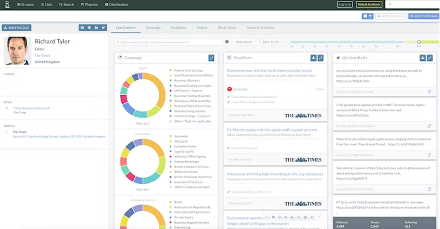 Journalist profiles: Journalist profiles provide useful information, such as their email address, social media accounts, publications, job title, coverage, recent headlines, interests, and more. The profiles are helpful when identifying if a journalist is right for your client, sector, and/or campaign. You also have access to colleagues in their publications and peers in the industry.